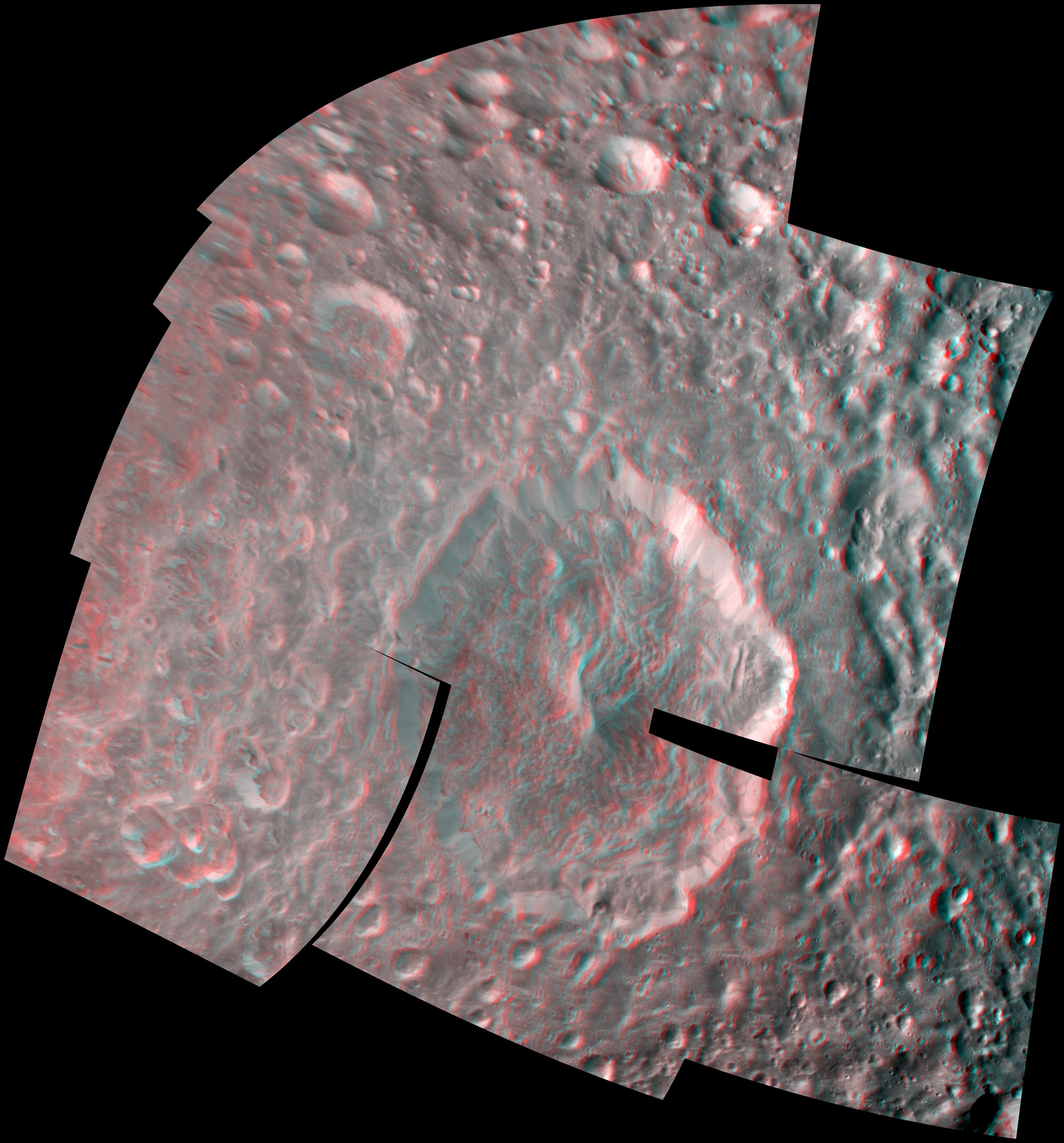 This 3-D view is a color composite mosaic made from 14 different black and white images that were taken from slightly different viewing angles. The images were re-projected to a simple cylindrical projection. The images were combined so that the viewer's left and right eye, respectively and separately, see a left and right image of the black and white stereo pair when viewed through red-blue glasses.