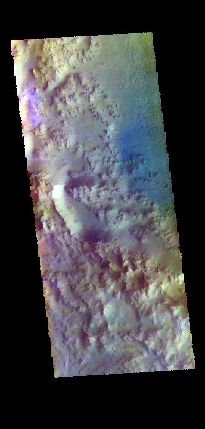 The THEMIS VIS camera contains 5 filters. The data from different filters can be combined in multiple ways to create a false color image. These false color images may reveal subtle variations of the surface not easily identified in a single band image. Today's false color image shows the western rim of an unnamed crater in Hesperia Planum.
