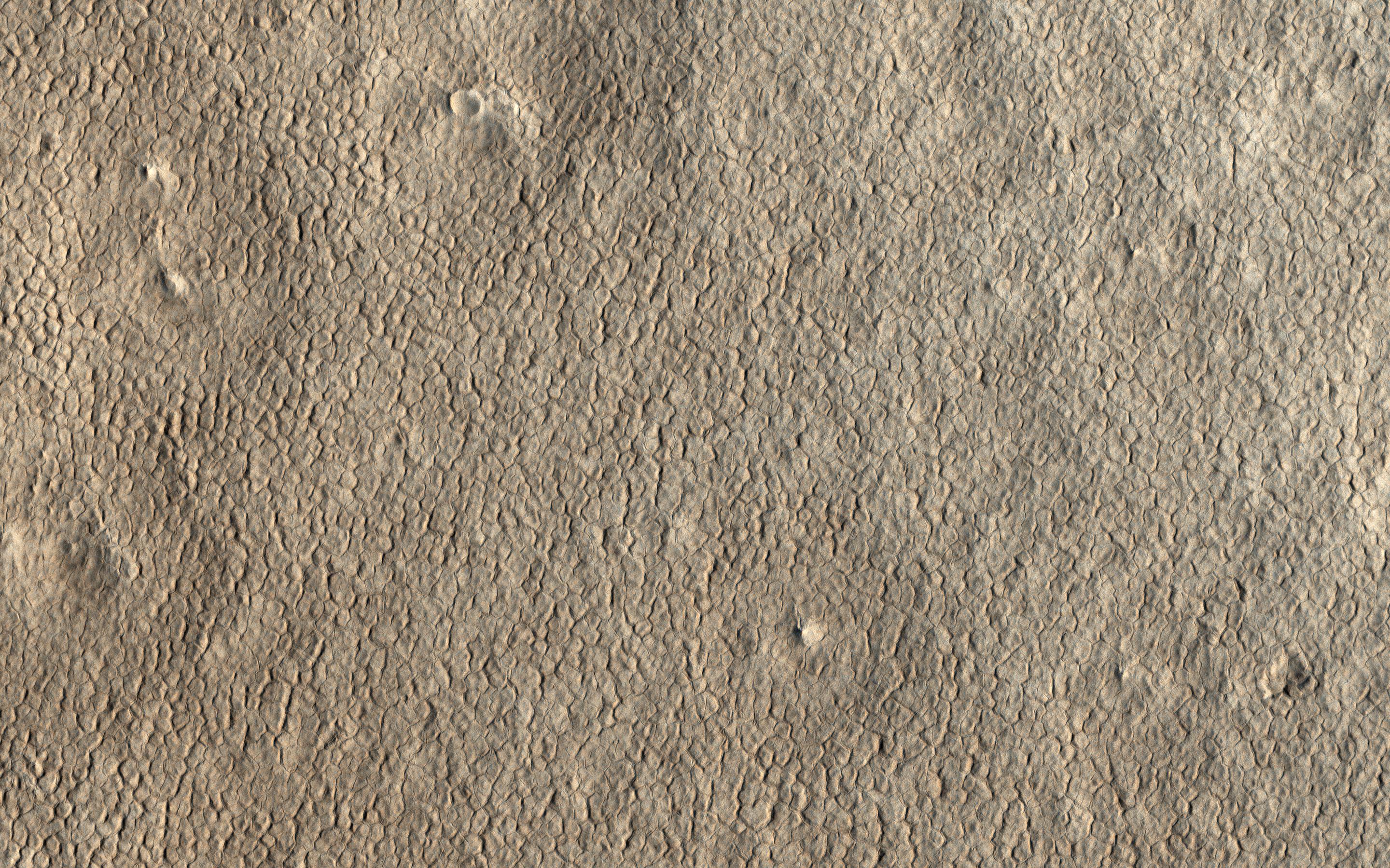 Polygonal patterns form by winter cooling and contraction cracking of the frozen ground. Over time these thin cracks develop and coalesce into a honeycomb network, with a few meters spacing between neighboring cracks. Shallow troughs mark the locations of the underground cracks, which are clearly visible form orbit.