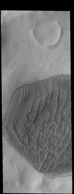 Today's VIS image shows a dune field on a crater floor in Terra Cimmeria. Dunes at high latitudes - near the polar caps - are affected by seasonal frost and ice. The interactions with frost/ice reduces the amount of movement of sand grains within the dunes. This changes the morphology of near polar dunes when compared to dunes at lower latitudes where ice/frost do not occur as frequently. This crater's latitude is 68 degrees south of the equator.