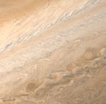 A high resolution image of the Jovian mid-latitudes taken by Voyager 1 on March 2, 1979, shows distinctly differing characteristics of the planet's meteorology. The well defined pale orange line running from southwest to northeast (North is at the top) marks the high speed north temperate current with wind speeds of about 120 meters per second. These high winds produce a cleaner flow pattern in the surrounding clouds. Toward the top of the picture, a weaker jet of approximately 30 meters per second is characterized by wave patterns and cloud features which have been observed to rotate in a clockwise manner at these latitudes of about 35 North. These clouds have been observed to have lifetimes of about one to two years. The picture was taken from a distance of 4 million kilometers (2.5 million miles).