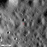 Arrow shows highest point on the Moon, 10,786 meters (35,387 feet) above the mean radius. North is up, Sun elevation is 16° from the horizon, image 500 meters (1640 feet) wide, from M133865651L,R mosaic.
