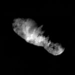 In this highest resolution view of the icy, rocky nucleus of comet Borrelly, (about 45 meters or 150 feet per pixel) a variety of terrains and surface textures, mountains and fault structures, and darkened material are visible over the nucleus's surface. This was the final image of the nucleus of comet Borrelly, taken just 160 seconds before Deep Space1's closest approach to it. This image shows the 8-km (5-mile) long nucleus about 3417 kilometers (over 2,000 miles) away.