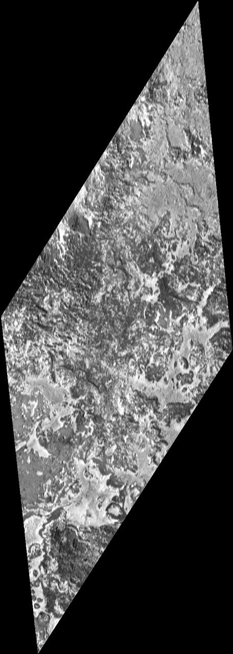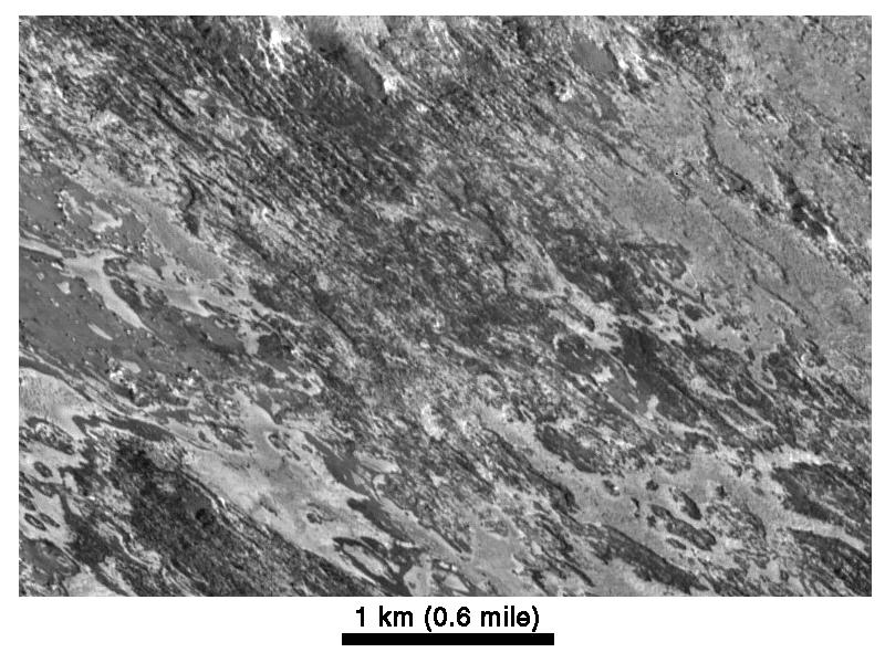 Galileo viewed the surface obliquely, tilted 72 degrees from straight overhead. Illumination is from the lower right, but the topographic shading is difficult to see because of the strong contrasts in brightness of the surface materials. The bright areas are generally higher in elevation than adjacent dark areas. The surface appears to have been eroded by an unknown process, in places exposing layers of bright and dark material. Evaporation of solid ice may also play a role in separating the bright and dark materials. North is toward the upper right.