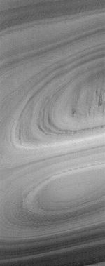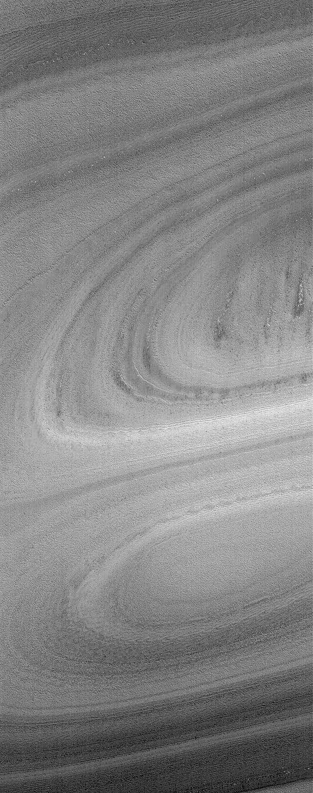 This Mars Global Surveyor (MGS) Mars Orbiter Camera (MOC) image shows exposures of north polar layered material -- perhaps composed of a mixture of dust and ice--in the form of a hill and an adjacent depression. The depression is in the lower half of the image and forms an oval shape at its lowest elevations. The hill is immediately above the depression (above the center of the image) and forms a similar pattern of arcuate bands. This scene is located near 85.7°N, 21.0°W. The image covers an area approximately 3 km (1.9 mi) wide. Sunlight illuminates the scene from the lower left.