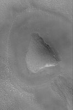 This Mars Global Surveyor (MGS) Mars Orbiter Camera (MOC) picture shows a rounded knob in the Propontis region of Mars near 43.1°N, 182.3°W. Dark dots on the hilltop and slopes are house-sized (and larger) boulders. The picture covers an area about 3 km (1.9 mi) across. Sunlight illuminates the scene from the lower left.