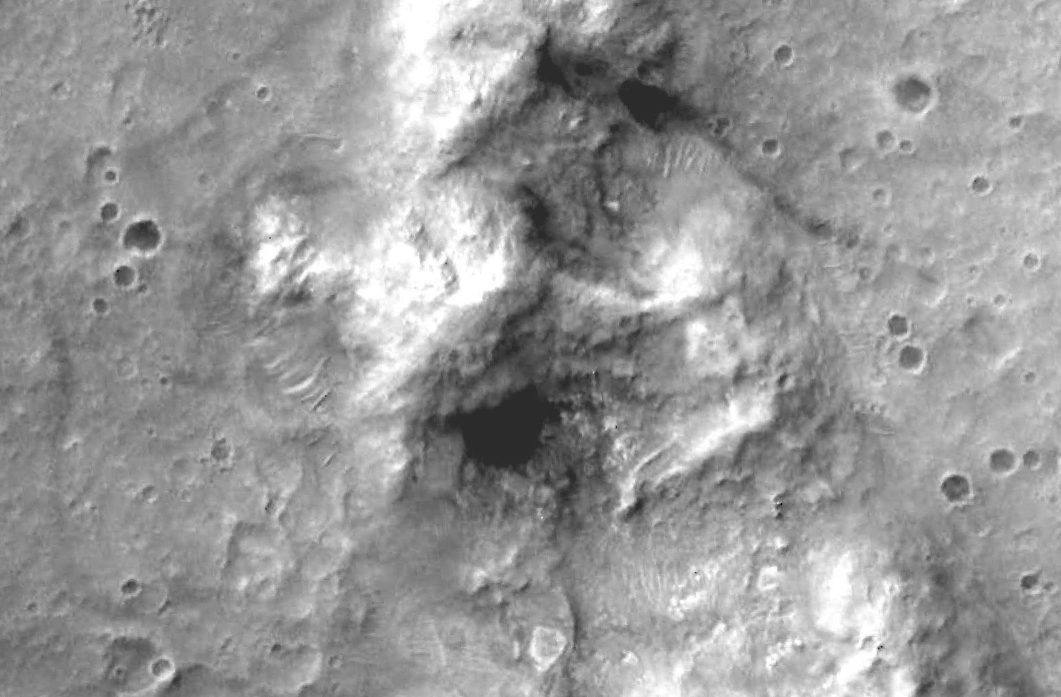 This view from orbit shows the region in the "Columbia Hills" where NASA's Mars Exploration Rover Spirit has been working since mid-2004. The area in the image is about 2.3 kilometers (1.4 miles) across. North is to the top. The bright region near the center is the north flank of "Husband Hill." The imagery is from the Mars Orbiter Camera on NASA's Mars Global Surveyor.