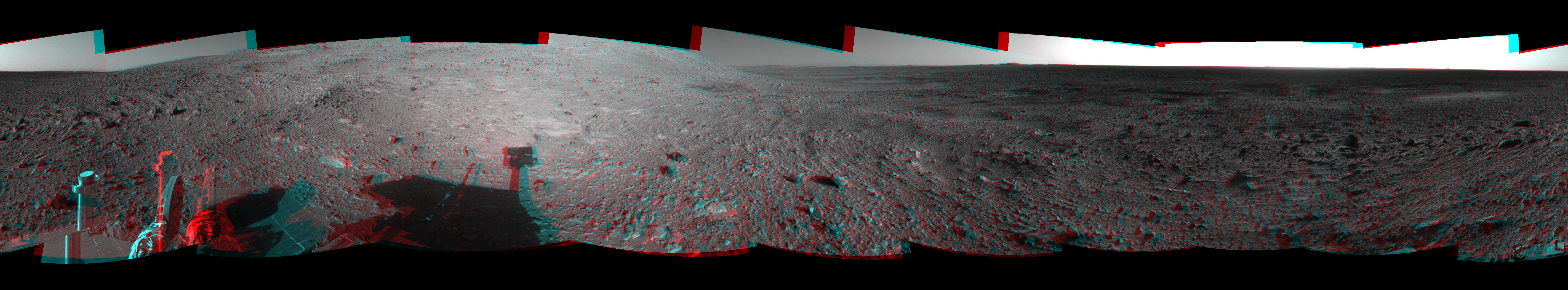This 360-degree stereo anaglyph of the terrain surrounding NASA's Mars Exploration Rover Spirit was taken on the rover's 189th sol on Mars (July 15, 2004). It was assembled from images taken by the rover's navigation camera at a position referred to as Site 72, which is at the base of the "West Spur" portion of the "Columbia Hills." The view is presented in a cylindrical-perspective projection with geometrical seam correction.