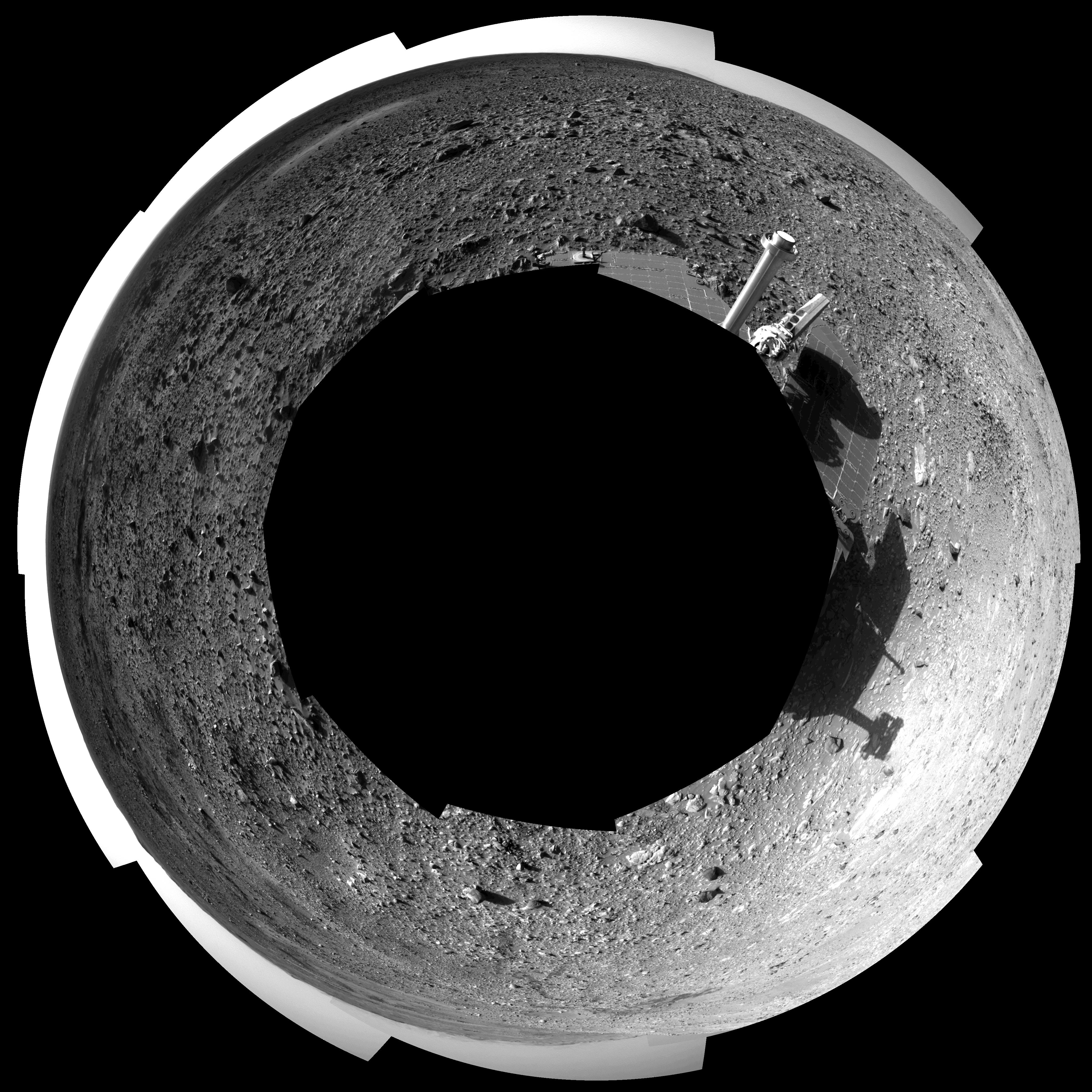 This 360-degree view shows the terrain surrounding NASA's Mars Exploration Rover Spirit on the rover's 189th sol on Mars (July 15, 2004). It was assembled from images taken by the rover's navigation camera at a position referred to as Site 72, which is at the base of the "West Spur" portion of the "Columbia Hills." The view is presented in a polar projection with geometrical seam correction.