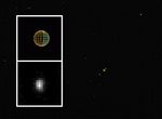 In the main frame, an arrow indicates Himalia. North is up. The inset shows the little moon magnified by a factor of 10, plus a graphic indicating Himalia's size and the direction of lighting (with sunlight coming from the left). Cassini's pictures of Himalia were taken during a brief period when Cassini's attitude was stabilized by thrusters instead of by a steadier reaction-wheel system. No spacecraft or telescope had previously shown any of Jupiter's outer moons as more than a star-like single dot.