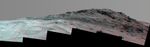 Dark rocks on Hinners Point show a pattern dipping downward toward the interior of Endeavour, to the right from this viewing angle. The strong dip may have resulted from the violence of the impact event that excavated the crater.