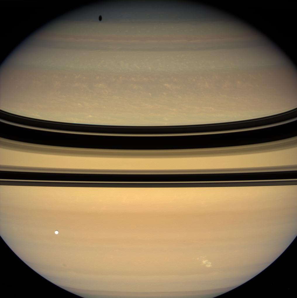 Images taken using red, green and blue spectral filters were combined to create this natural color view. The images were acquired with the Cassini spacecraft wide-angle camera at a distance of approximately 1.7 million kilometers (1 million miles) from Saturn. Image scale is 97 kilometers (60 miles) per pixel.