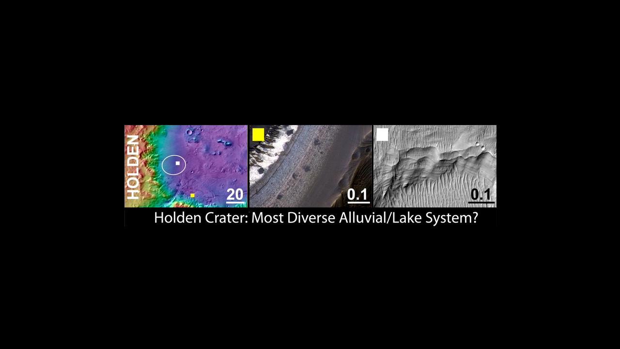 The middle panel shows an example of a high priority science targets for exploration near the ellipse, and the right column shows science targets within the ellipse (white box in left column shows the location of each). Holden and each of the three of three finalist Mars Science Laboratory landing sites display a variety of very interesting targets for exploration within and outside of the proposed landing ellipse.