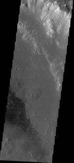Note: this THEMIS visual image has not been radiometrically nor geometrically calibrated for this preliminary release. An empirical correction has been performed to remove instrumental effects. A linear shift has been applied in the cross-track and down-track direction to approximate spacecraft and planetary motion. Fully calibrated and geometrically projected images will be released through the Planetary Data System in accordance with Project policies at a later time.