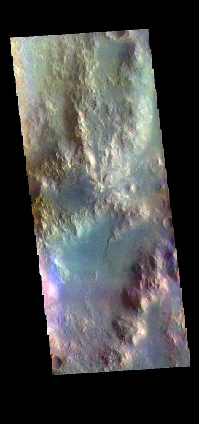 The THEMIS VIS camera contains 5 filters. The data from different filters can be combined in multiple ways to create a false color image. These false color images may reveal subtle variations of the surface not easily identified in a single band image. Today's false color image shows part of the rim of Holden Crater. Located in Noachis Terra, Holden Crater is 152km (94 miles) in diameter.