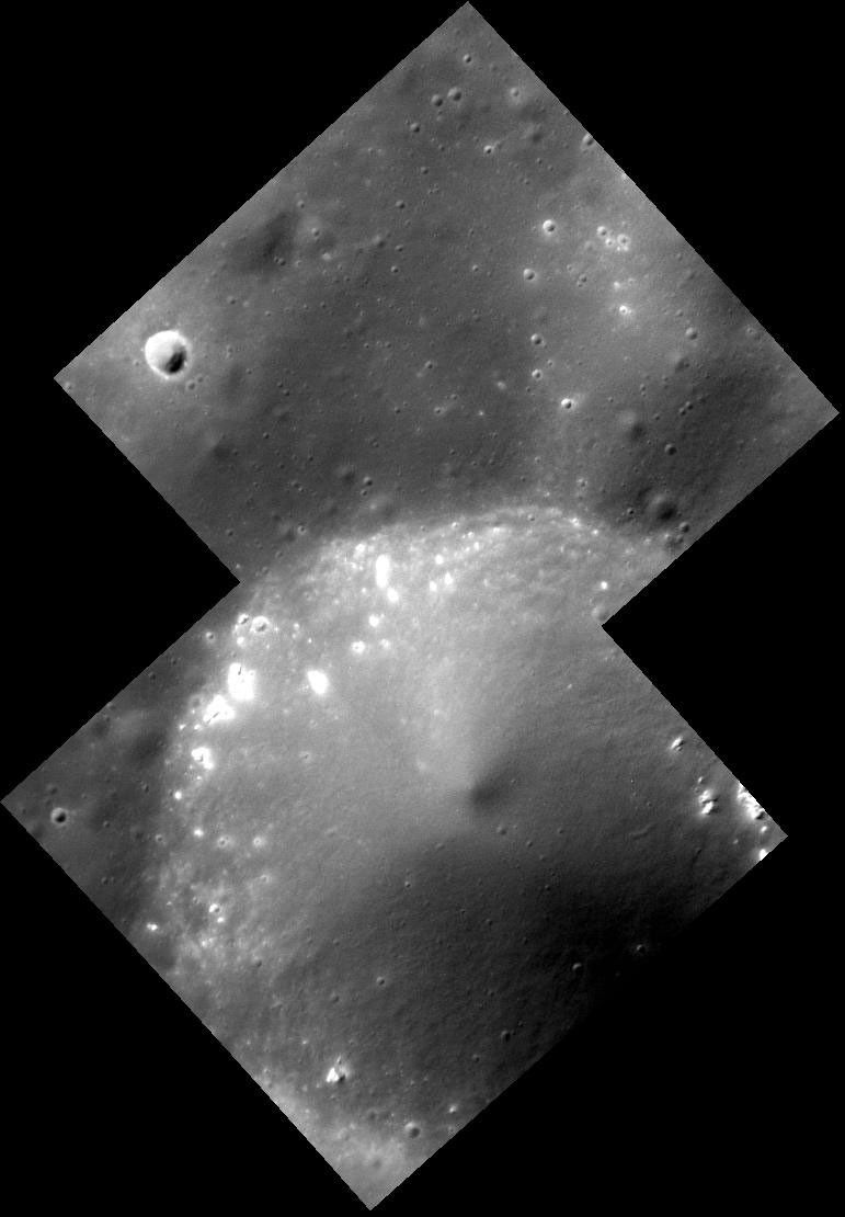 This crater is approximately 170 km southwest of the flooded Dali basin, along the rim of an old, mostly flooded basin. The rims of Dali and nearby flooded basins are composed of low reflectance material, which is often seen in conjunction with hollows. Indeed, scattered hollows appear along the rim of this small, simple crater.