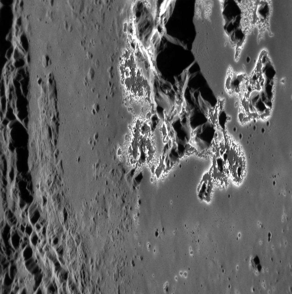 The central peaks of Eminescu are revealed here at high resolution, showing off an impressive collection of hollows. Some of these hollows have coalesced into larger formations. North is down in this image.