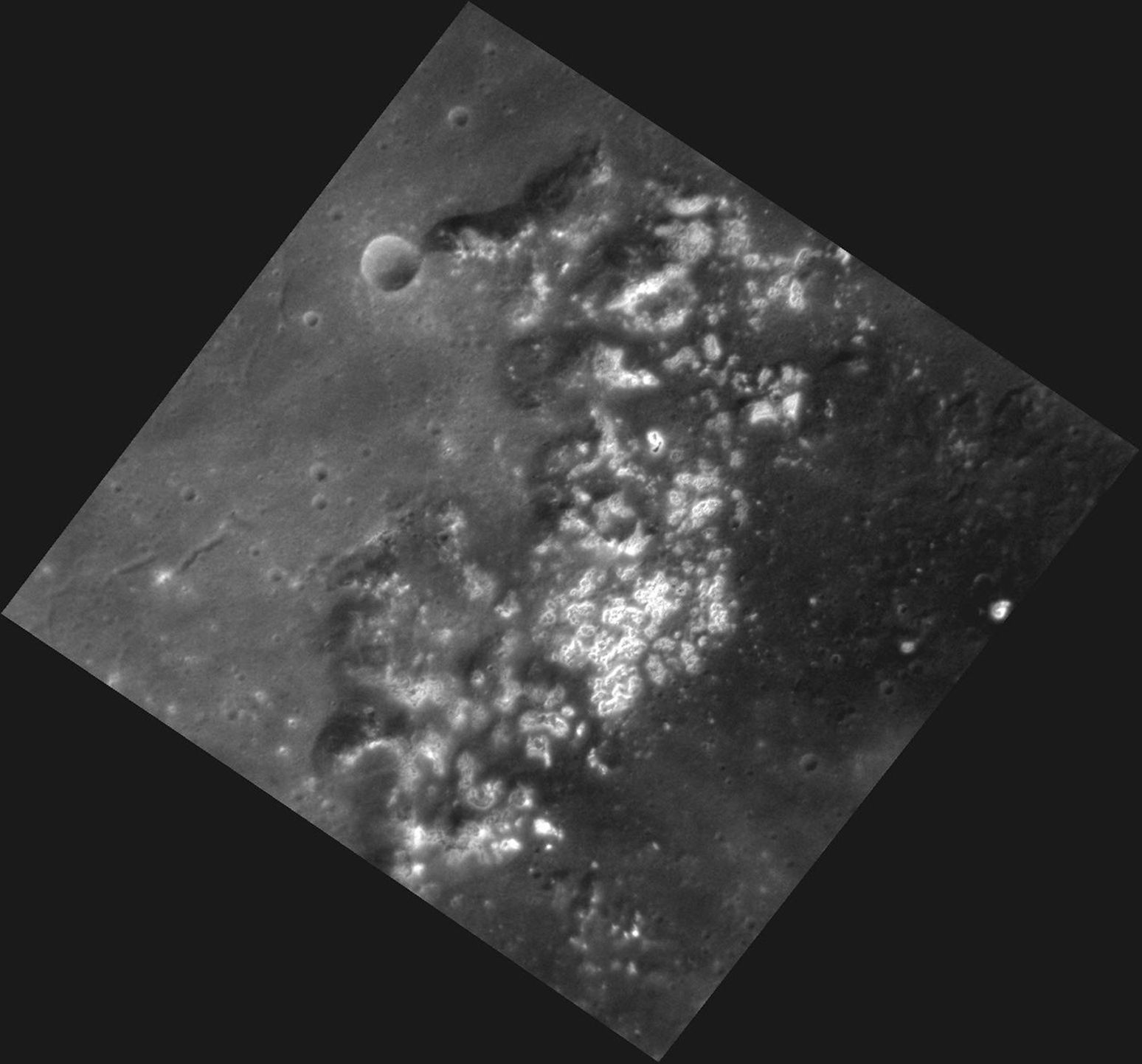 This image, taken with the Narrow Angle Camera (NAC), shows an area of hollows on the floor of Raditladi basin. Hollows were first discovered on the surface of Mercury during MESSENGER's orbital mission and have not been seen on the Moon or on any other rocky planetary bodies. These bright, shallow depressions may have been formed by the loss of volatile materials. This same region has also been imaged in color.