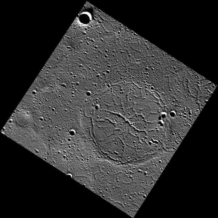 This scene, which lies within the Goethe basin, shows a ghost crater that is approximately 45 km in diameter. The crater contains prominent graben (extensional troughs) and is bound by a wrinkle ridge ring that marks the location of the crater rim.
