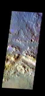 The THEMIS VIS camera contains 5 filters. The data from different filters can be combined in multiple ways to create a false color image. These false color images may reveal subtle variations of the surface not easily identified in a single band image. Today's false color image shows part of the northern rim of Horowitz Crater. Horowitz Crater is located in Terra Cimmeria.