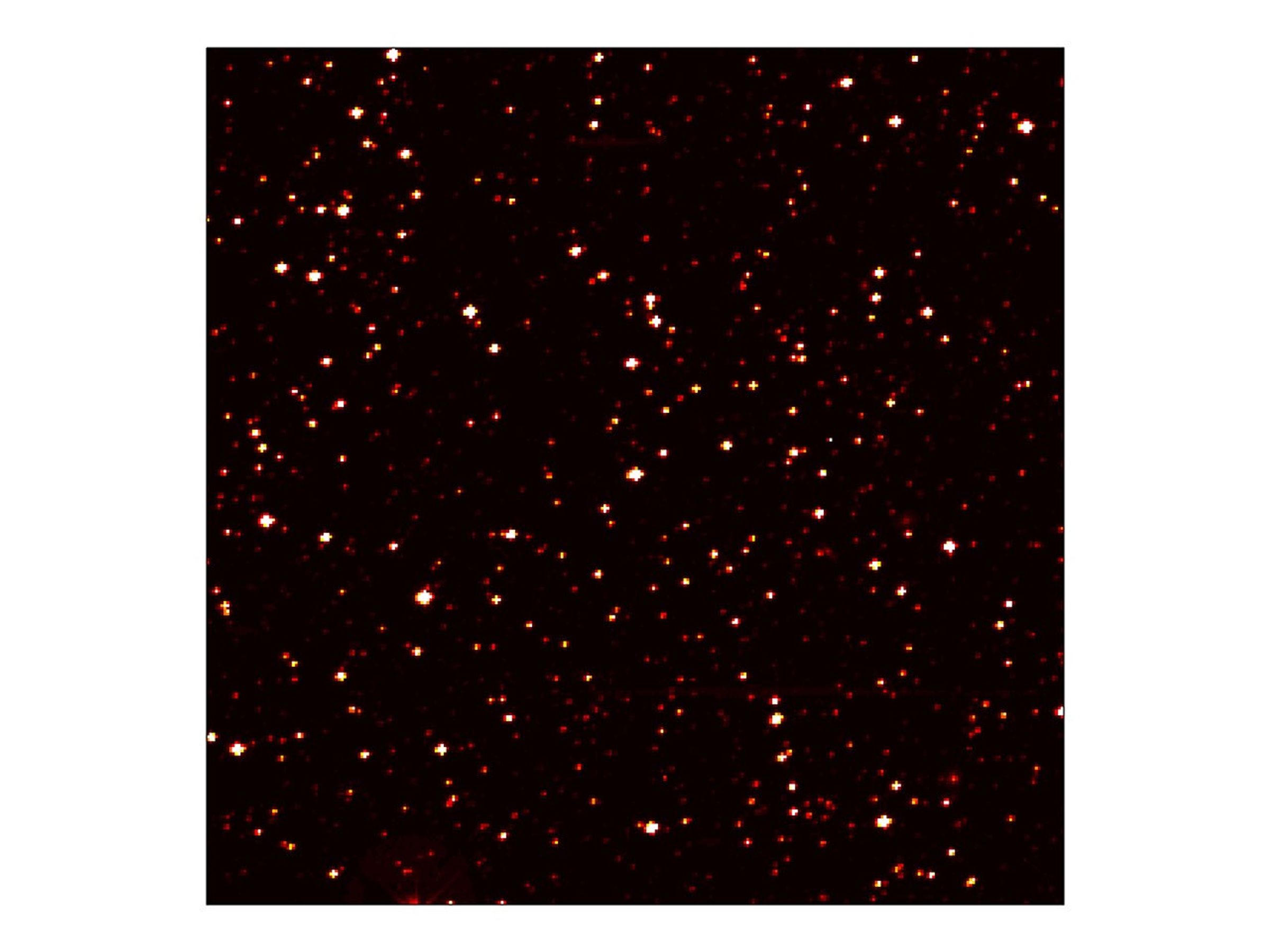 The area pictured is one-thousandth of Kepler's full field of view, and shows hundreds of stars at the very edge of the constellation Cygnus. The image has been color-coded so that brighter stars appear white, and fainter stars, red. It is a 60-second exposure, taken on April 8, 2009, one day after the spacecraft's dust cover was jettisoned.