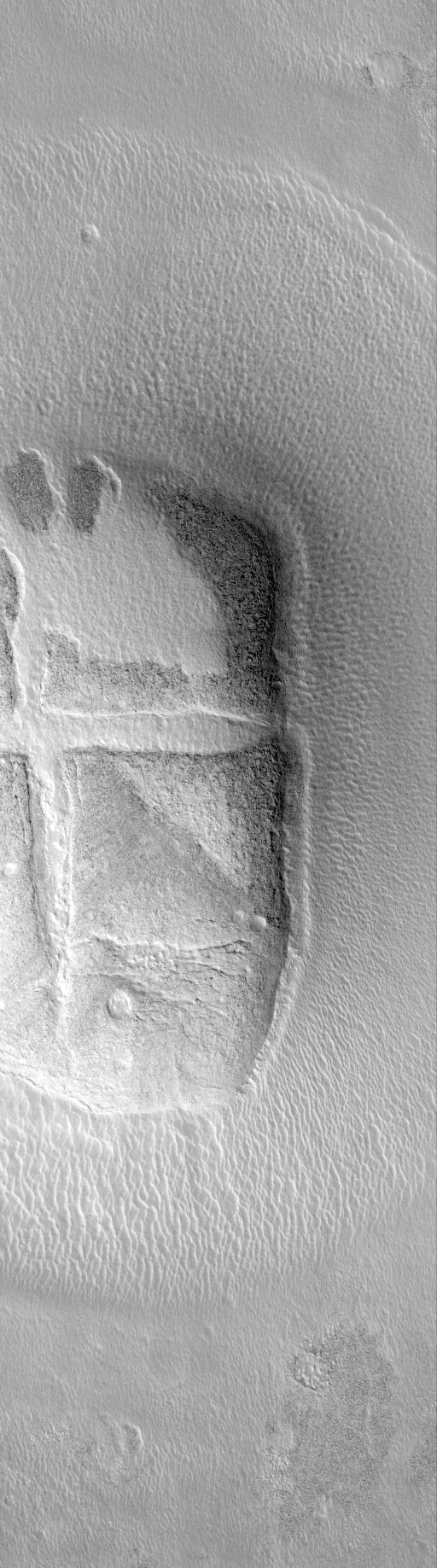 The Mars Global Surveyor Mars Orbiter Camera narrow angle image (top) shows what, at first glance, might look like a "hot crossed bun" on the martian northern plains. The context for this landform is shown in the picture on the right. Unlike the southern highlands of Mars, the northern plains are lower and have far fewer impact craters on them. The relatively few craters that are present in the north have been severely eroded and/or buried. The context image shows a circle of mounds on the northern plains near the Phlegra Montes. These mounds were once the rim of a crater formed by impact of a meteorite. The mound in the high-resolution view (top) has been cracked and was at one time mostly covered by a thin veneer of light-toned material that is now seen only partly covering it. These two pictures were taken simultaneously on August 16, 1999, and occur near 45.9°N, 191.1°W. Both images are illuminated by sunlight from the lower right, the high resolution picture covers an area 3 km (1.9 mi) wide by 10.8 km (6.7 mi) long; the context image is about 115 km (71 miles) on a side. The bright, wispy features in the context image are clouds, their dark shadows can be seen cast upon the surface to the right of each cloud feature.