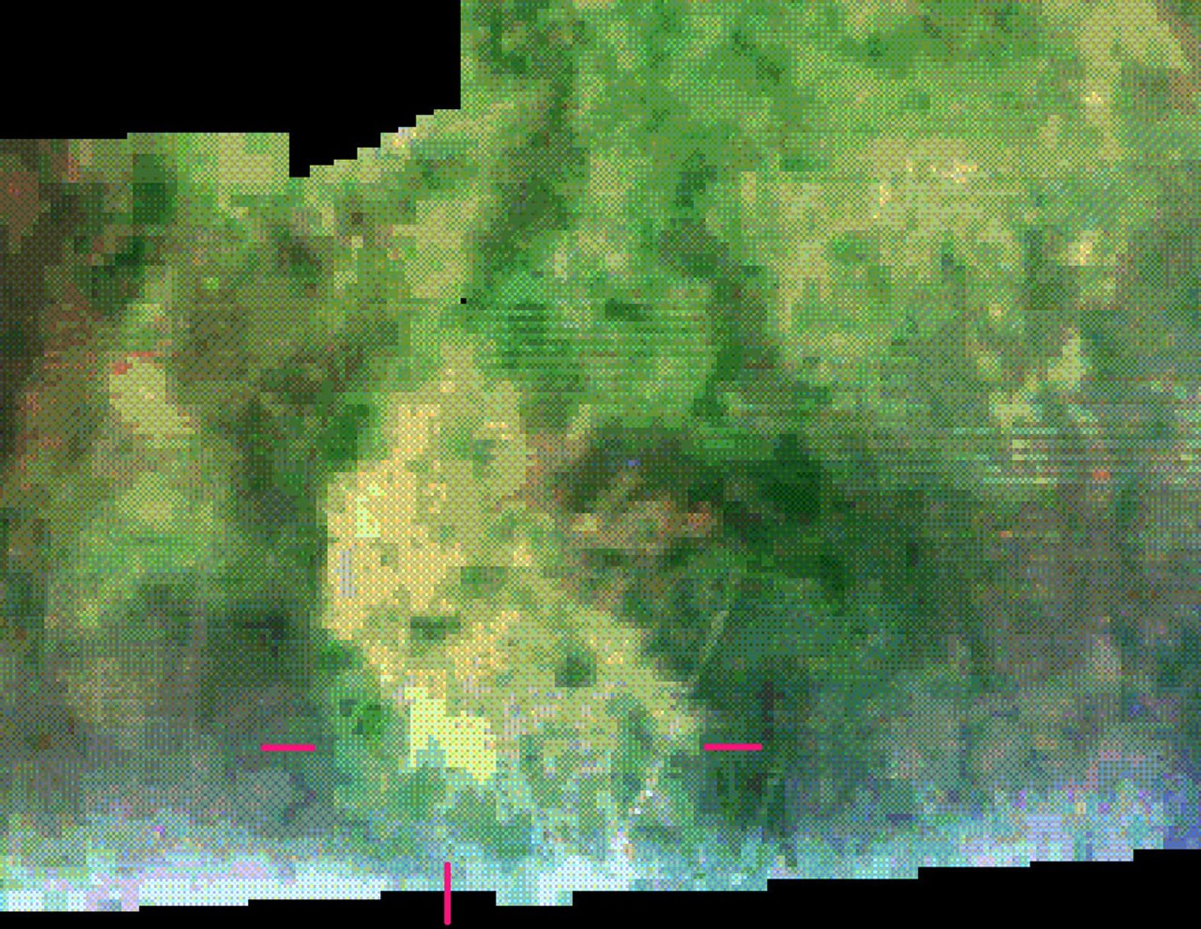 The brightness variations, combined with flow-like morphology seen in higher resolution Cassini radar images, suggest that Hotei Arcus may be the site of current activity, possibly an ice volcano. If so, it would be the first active cryovolcano to be observed on Titan. The red markings in the false color image (Figure 1) indicate a region that is chemically distinct from its surroundings, which may correspond to the most recent location of activity.