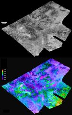 The region shown here is centered near 30 degrees south latitude, 83 degrees west longitude, and is about 860 kilometers (530 miles) across. The maps are in equirectangular projection with north at the top. The images used for mapping were acquired during flybys on Feb. 22, 2008, and May 12, 2008 (known as T41 and T43). The T41 image is shown in black and white at the top. It has a pixel spacing of 351 meters (about 1,200 feet). Below, the same image is shown with color coding to indicate elevations, as shown by the color bar at left. The total range of relief from purple (low) to red (high) is 500 meters (about 1,600 feet). Zero elevation corresponds to a distance of 2,575 kilometers (1,600 miles) from the center of Titan, which is approximately the average radius of the satellite.