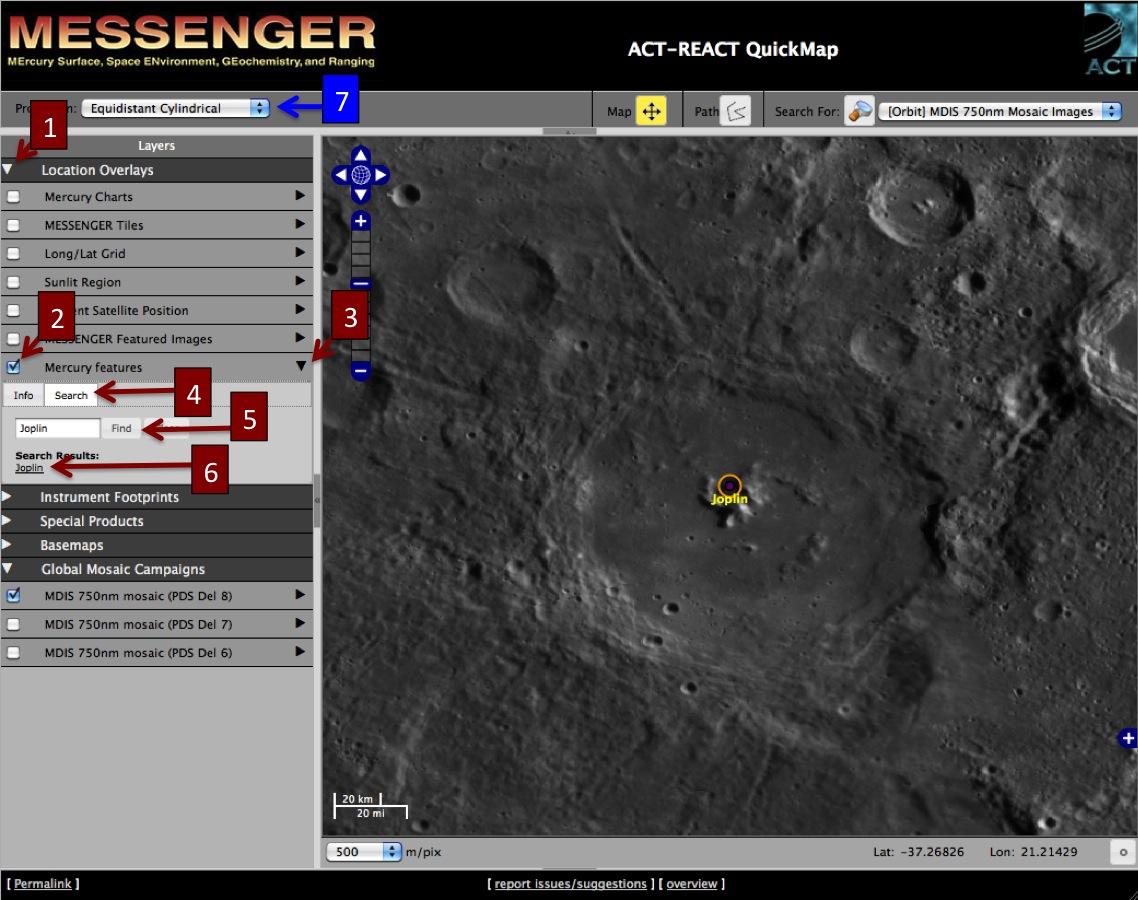 [As a note, the newly named craters Disney, Kobro, and Komeda are located in Mercury's southern region and may be easier to explore by changing the map projection to "South Polar Stereographic." (7 in the above image)]