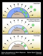 This diagram illustrates how hypothetical helium atmospheres might form. These would be on planets about the mass of Neptune, or smaller, which orbit tightly to their stars, whipping around in just days. They are thought to have cores of water or rock, surrounded by thick atmospheres of gas. Radiation from their nearby stars would boil off hydrogen and helium, but because hydrogen is lighter, more hydrogen would escape. It's also possible that planetary bodies, such as asteroids, could impact the planet, sending hydrogen out into space. Over time, the atmospheres would become enriched in helium.