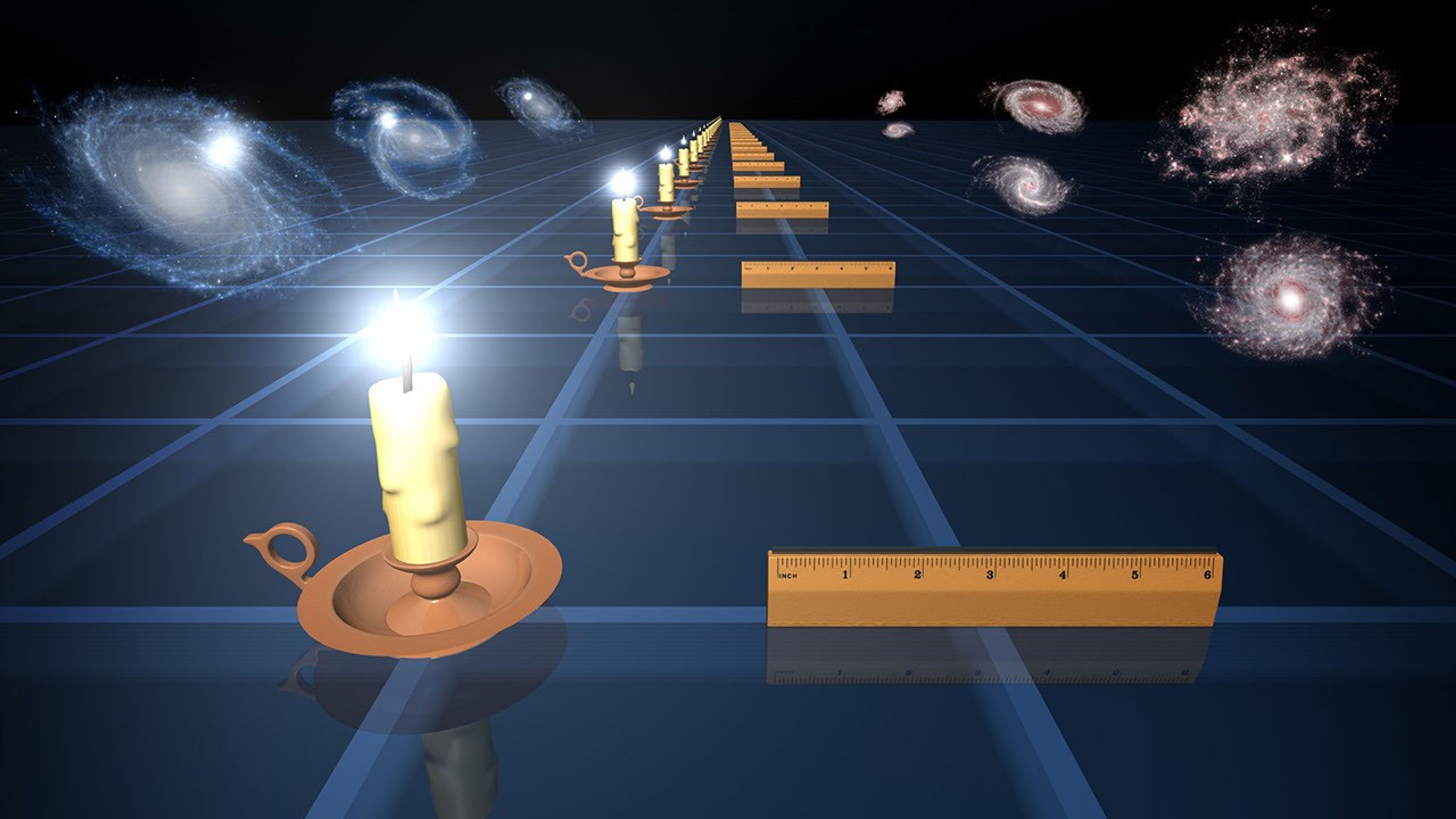 This diagram illustrates two ways to measure how fast the universe is expanding. In the past, distant supernovae, or exploded stars, have been used as "standard candles" to measure distances in the universe, and to determine that its expansion is actually speeding up. The supernovae glow with the same intrinsic brightness, so by measuring how bright they appear on the sky, astronomers can tell how far away they are. This is similar to a standard candle appearing fainter at greater distances (left-hand illustration).