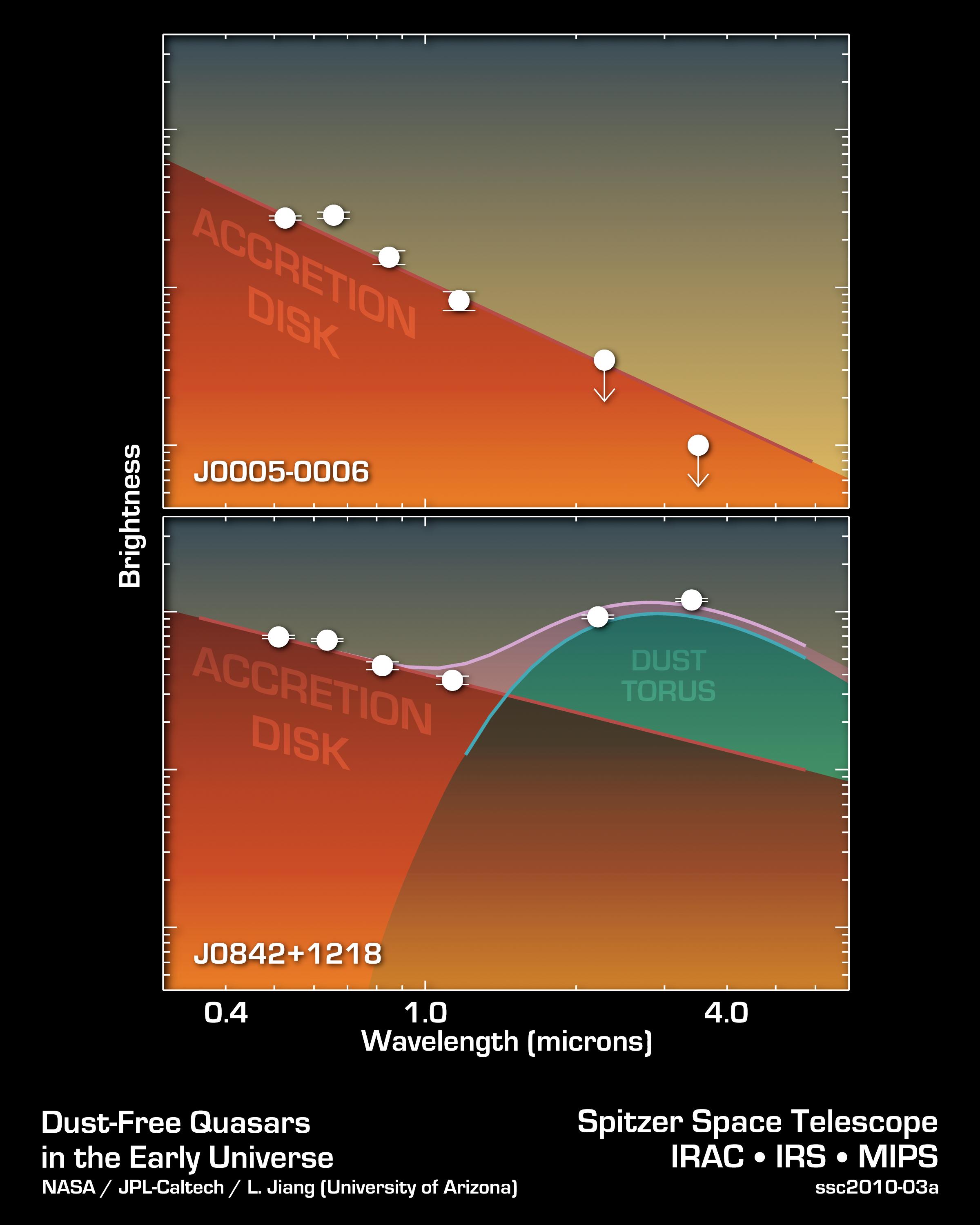 These two data plots from NASA's Spitzer Space Telescope show a primitive supermassive black hole (top) compared to a typical one. As the data show, the typical supermassive black hole, called J0842+1218, exhibits the signs of a surrounding ring of dust, a feature that appears at longer wavelengths of infrared light. The primitive object, called J0005-0006, lacks a dusty torus.