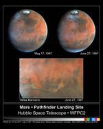 NASA's Hubble Space Telescope images of Mars, taken on June 27, 1997, reveal a significant dust storm which fills much of the Valles Marineris canyon system and extends into Xanthe Terra, about 600 miles (1000 kilometers) south of the landing site.
