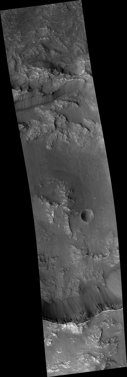 The long streamers of material are from downslope movements. Also revealed in this slope are a variety of bedrock textures, with a mix of layered and jumbled deposits. This sample is typical of the Martian highlands, with lava flows and water-lain materials depositing layers, then broken up and jumbled by many impact events.