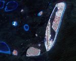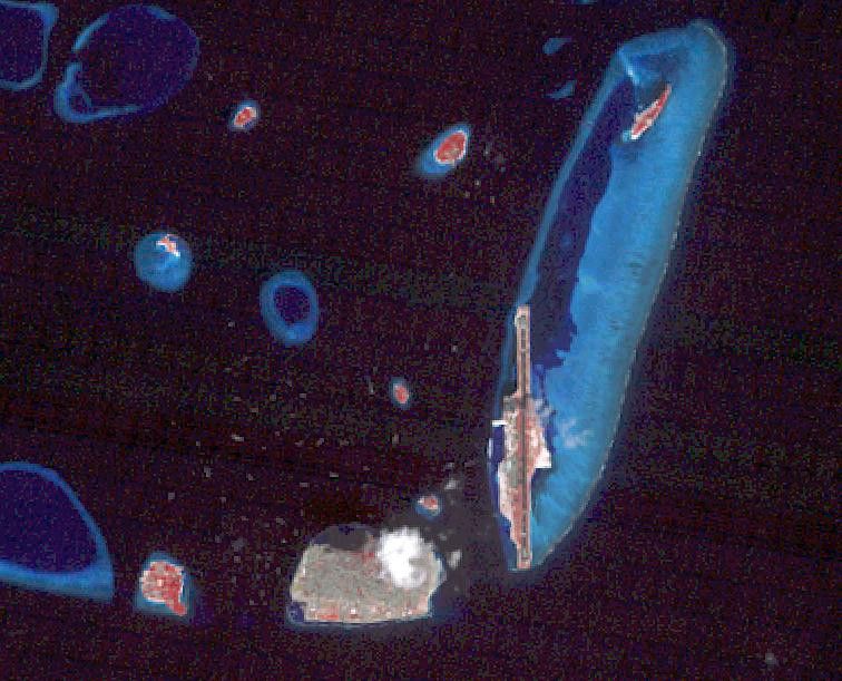 The Maldives nation, in the Indian Ocean, faces an environmental threat from sea level rise, as 80% of its islands are less than 1 m above seal level. To counter this threat, the country is creating a new artificial island, Hulhumale. The capital city of Male, southwest of the new island and the airport, houses 130,000 people in 2.5 sq km. By 2019, more than 50,000 people had moved to Hulhumale, with plans to host 240,000 of the nation's people by the mid-2020s (BBC.com, December 31, 2020). The ASTER image was acquired December 22, 2018, the Landsat-5 image (Figure 1) was acquired February 3, 1999. The images cover an area of 9.2 by 11.3 km, and are located at 4.2 degrees north, 73.5 degrees east.