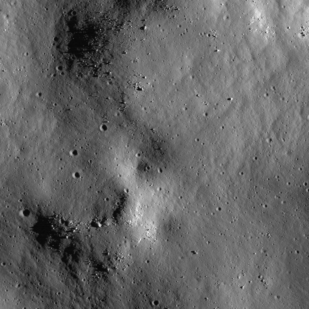 NAC image M115475912R shows hummocky terrain north of the central peak of Tsiolkovskiy, still within the crater rim but outside the region flooded by mare basalt. The hummocks formed as the crater rebounded after the shock of impact dissipated. Image is 940 meters wide, or 3083 feet, with an incidence angle of 75°.
