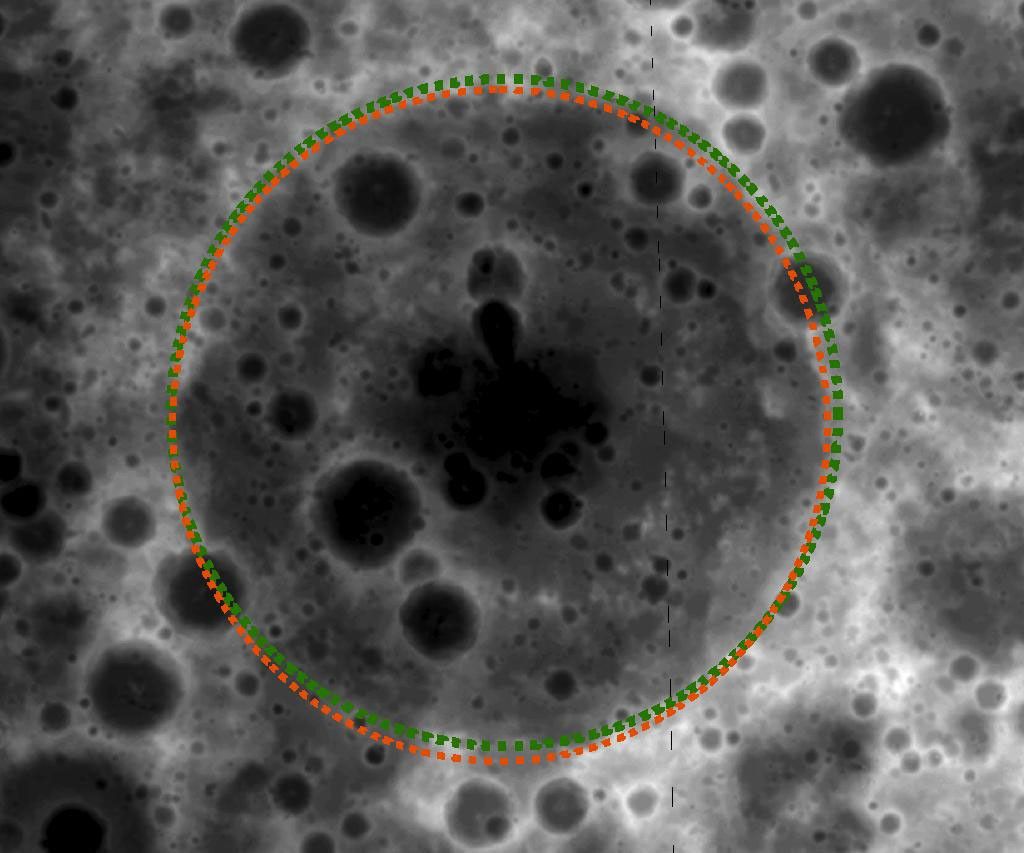 A lesser-known impact basin, Freundlich-Sharonov, is visible in this Digital Terrain Model (DTM) made from LROC WAC stereo images, and darker shades represent lower elevations than brighter shades. The diameter of the orange-colored ring is 595 kilometers or 370 miles. DTM images like these allow scientists to inventory and study the morphologies of lunar basins.