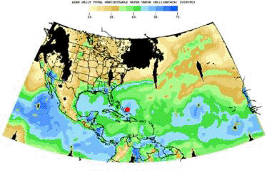 This movie shows the total precipitable water vapor from August 23 through September 2, 2004. You can see Hurricane Frances as it moves through the Caribbean toward Florida, and the changes in intensity are visible. The eye has been marked with a red spot. The water vapor encompassed by the hurricane is also the result of the very strong convection which is an integral part of the formation and intensification of tropical storms. If you look at the last frame of the movie in the lower right corner, you can see the emergence of a new tropical storm. Ivan makes its debut in the Atlantic.