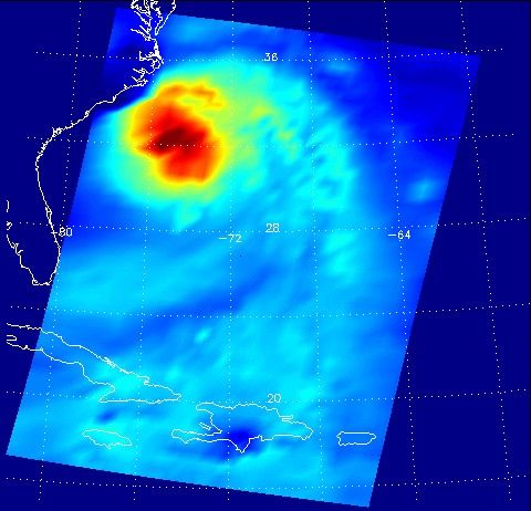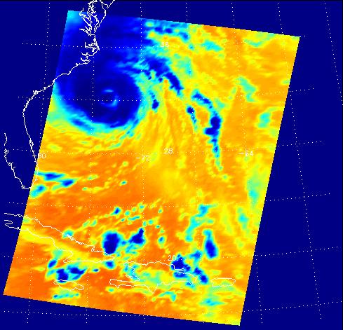 These two false-color images show Hurricane Isabel viewed by the AIRS and AMSU-A instruments at 1:30 EDT in the morning of Thursday September 18, 2003. Isabel will be ashore within 12 hours, bringing widespread flooding and destructive winds. In figure 1 on the left, data retrieved by the AIRS infrared sensor shows the hurricane's eye as the small ring of pale blue near the upper left corner of the image. The dark blue band around the eye shows the cold tops of hundreds of powerful thunderstorms. These storms are embedded in the 120 mile per hour winds swirling counterclockwise around Isabel's eye. Cape Hatteras is the finger of land north-northwest of the eye. Isabel's winds will soon push ashore a 4- to 8-foot high mound of 'storm surge' and accompanying high surf, leading to flooding of Cape Hatteras and other islands of North Carolina's Outer Banks. Also seen in the image are several organized bands of cold, (blue) thunderstorm tops being pulled into the storm center. Other thunderstorm are forming north of the islands of Jamaica, Cuba, Hispaniola and Puerto Rico near the bottom of the picture.