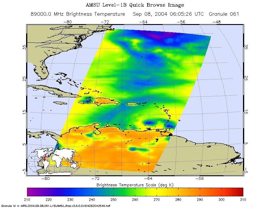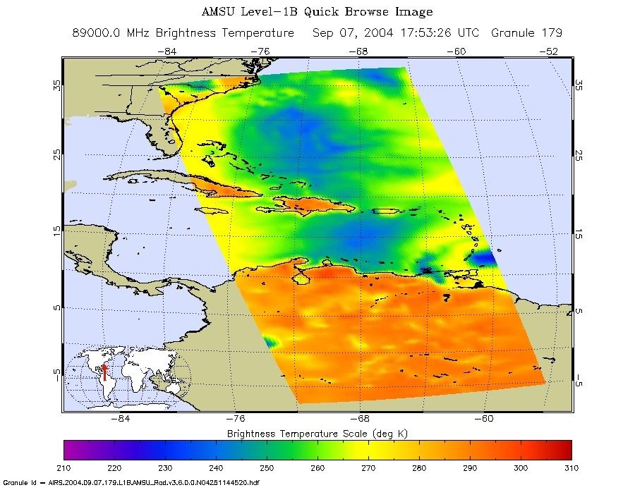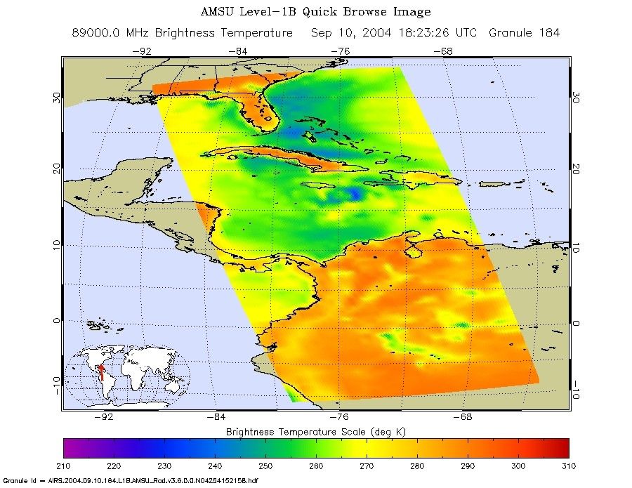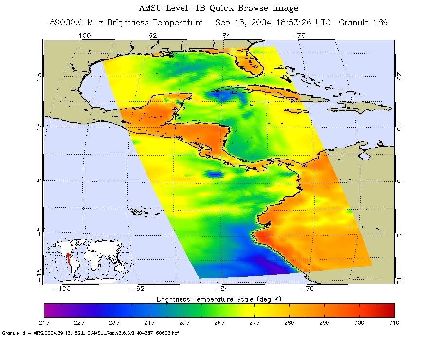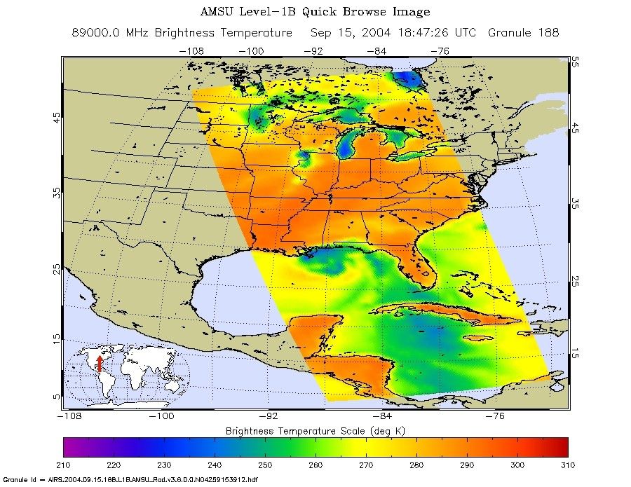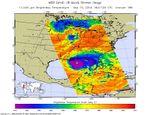 The microwave image (figure 2) reveals where the heaviest precipitation in Ivan is taking place. The blue areas within the storm show the location of this heavy precipitation. Blue areas outside of the storm where there are moderate or no clouds are where the cold (in the microwave sense) sea surface shines through. The image shows that the largest area of intense convection/precipitation is in the NE quadrant, centered near New Orleans. There is a smaller but still quite intense area in the SE quadrant trailing the center of the storm that might impact the Alabama coast.