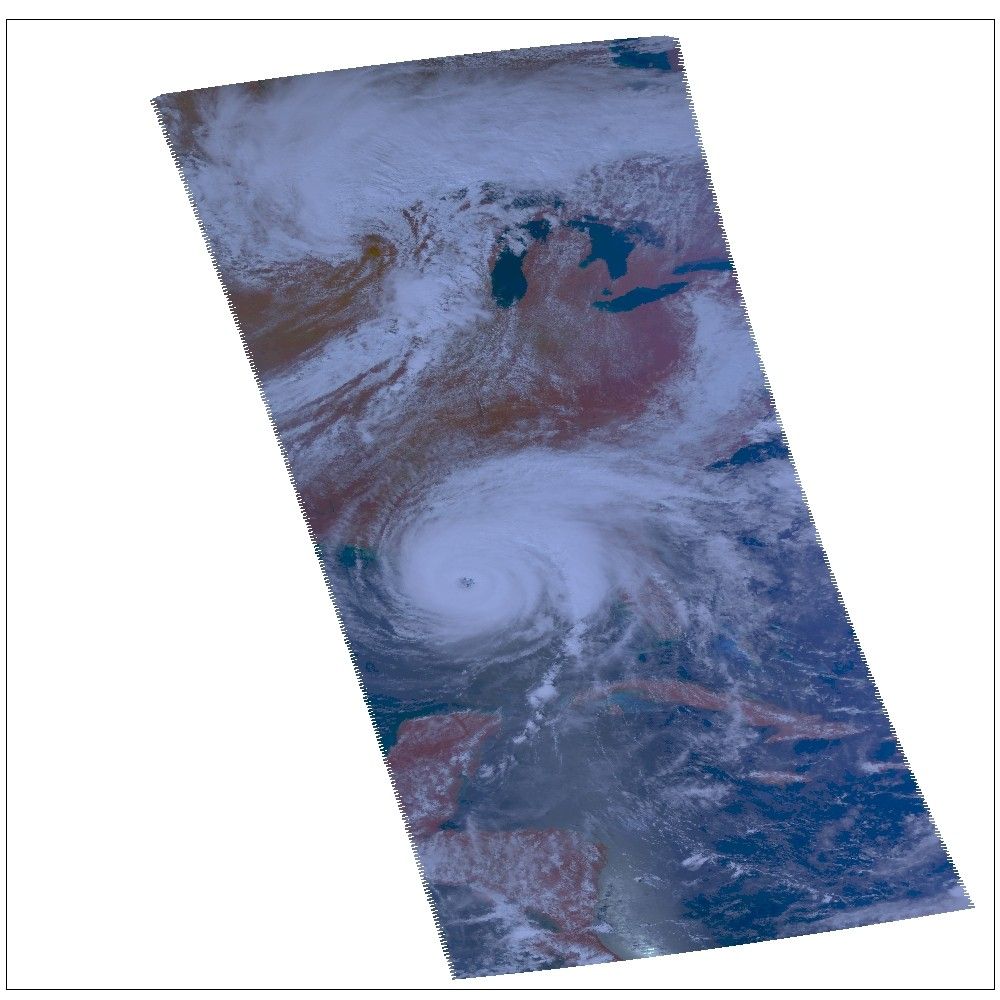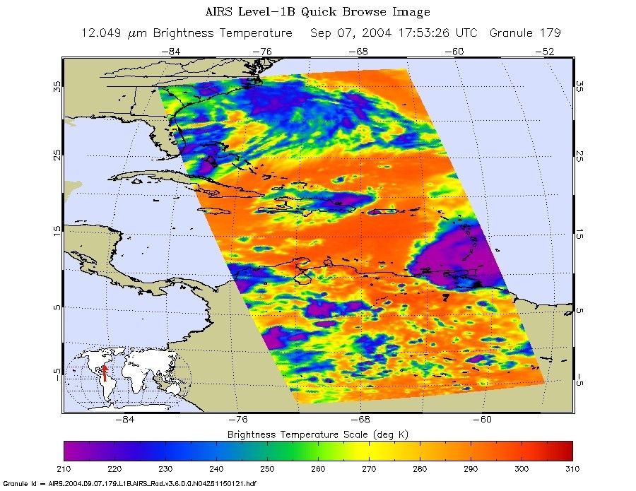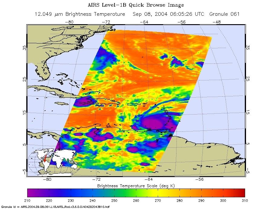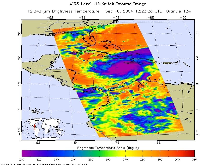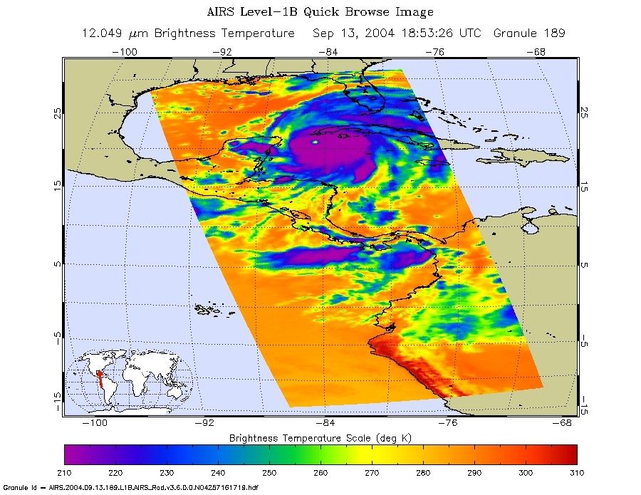 This image shows how the storm looks through an AIRS Infrared window channel, and reveals a very large eye - about 75 km (50 miles) across. Window channels measure the temperature of the cloud tops or the surface of the Earth in cloud-free regions. The lowest temperatures are associated with high, cold cloud tops that make up the top of the hurricane. The infrared signal does not penetrate through clouds, so the purple color indicates the cool cloud tops of the storm. In cloud-free areas, the infrared signal is retrieved at the Earth's surface, revealing warmer temperatures. Cooler areas are pushing to purple and warmer areas are pushing to red.
