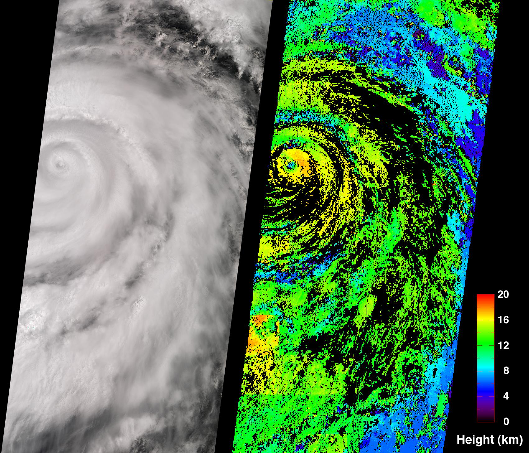 On the left is a true-color image produced by MISR's nadir (vertical-viewing) camera. Impressive spiral arms wrapped around the eye are apparent. Several areas of convective cloud can be discerned along the arms. The eye of the storm is centered at 18.8N latitude and 109.8W longitude (about 480 kilometers south of Cabo San Lucas, Mexico). On the right is the cloud-top height field derived using automated computer processing of the data from multiple MISR cameras. Relative height variations are well represented, such as the clearing within the storm's eye. The stereoscopic data processing algorithm used to generate these results is still being refined. Future versions of this product may show modest changes in the height values compared to the preliminary values displayed here. Areas where heights could not be retrieved are shown in black. The observations cover a 380-kilometer swath width, and were acquired during Terra orbit 9442.
