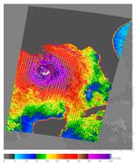 Nearly the whole of the Gulf of Mexico was churning with the powerful winds and rains of Hurricane Katrina on August 28, 2005, when NASA's QuikScat satellite captured this image. The image depicts relative wind speeds swirling around the calm center of the storm. The highest wind speeds, shown in shades of purple, circle a well-defined eye, with gradually weakening winds radiating outward. The barbs reveal wind direction, and the white barbs show heavy rainfall. At the time this image was taken, the National Hurricane Center reported that Katrina had winds of 160 miles per hour (257 kilometers per hour or 140 knots) with stronger gusts and was moving north-northwest at about 10 mph (16 km/hr). The storm weakened slightly before coming ashore, but was still a powerfully destructive storm.