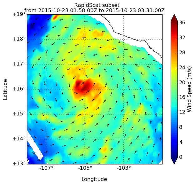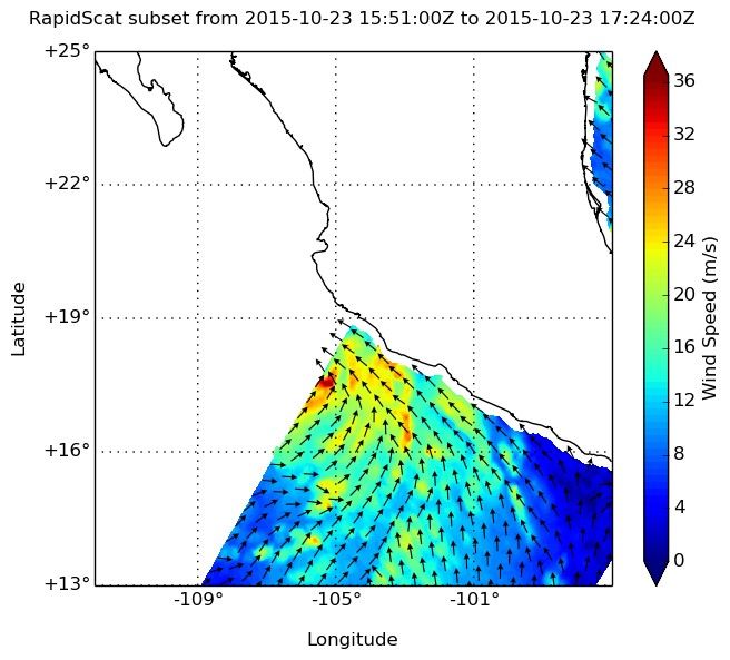 NASA's ISS-RapidScat passed over Hurricane Patricia at about 3:00 AM GMT on Oct. 23, 2015. A Hurricane Warning was in effect from San Blas to Punta San Telmo. A Hurricane Watch was in effect from east of Punta San Telmo to Lazaro Cardenas and a Tropical Storm Warning was in effect from east of Punta San Telmo to Lazaro Cardenas.