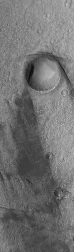 This Mars Global Surveyor (MGS) Mars Orbiter Camera (MOC) image shows the results of wind action on the floor of the giant martian impact basin, Huygens. The large crater in this image has a wind streak on its lee side, pointing toward the lower right (southeast). Usually, a light-toned wind streak behind a crater on Mars will be composed of a thin veneer of dust that the wind was not able to erode because it was protected by the presence of the crater's raised rims. In this case, the streak is caused by something different -- by the fact that dark, windblown sand has not been able to accumulate behind the crater.