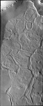 The dissected appearing surface in this VIS image is called Hyperboreus Labyrinthus and is located just south of the north polar cap. The linear depressions are most likely caused by tectonic stress rather than be carved by water.