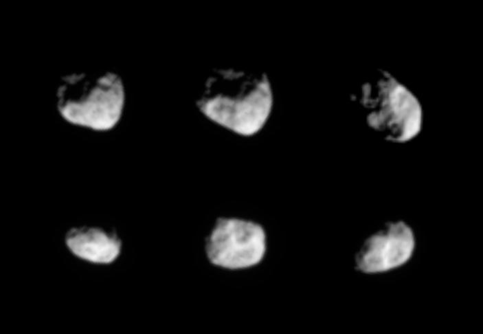 The images were taken in visible light with the Cassini spacecraft narrow-angle camera in October 2004 and February 2005, at distances ranging from 1.3 to 1.6 million kilometers (808,000 to 994,000 million miles) from Hyperion and at Sun-Hyperion-spacecraft, or phase, angles ranging from 42 to 66 degrees. Resolution in the original images was 8 to 10 kilometers (5 to 6 miles) per pixel. The images have been contrast-enhanced and magnified by a factor of two to aid visibility.