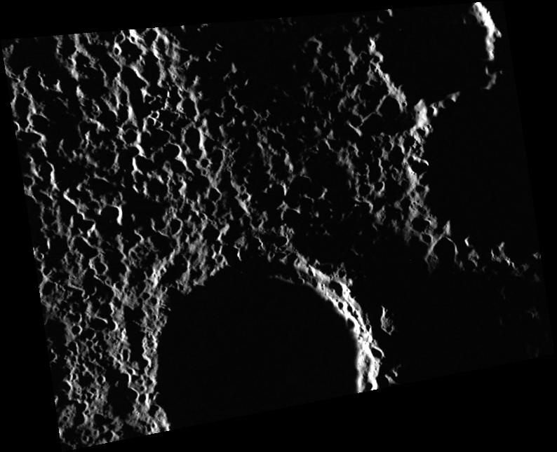 The Sun was barely above the horizon when this image was obtained, and the strong shadows emphasize the ruggedness of the terrain. The surface appears to be almost completely covered by -- or saturated with -- relatively small impact craters (about 2 to 3 km in diameter). Many of these may be secondary craters from a large impact in the vicinity, but it is difficult to tell from which one these small craters originate.