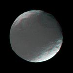This stereo view of Iapetus was created by combining two Cassini images, which were taken one day apart. The view serves mainly to show the spherical shape of Iapetus and some of the moon's topography.