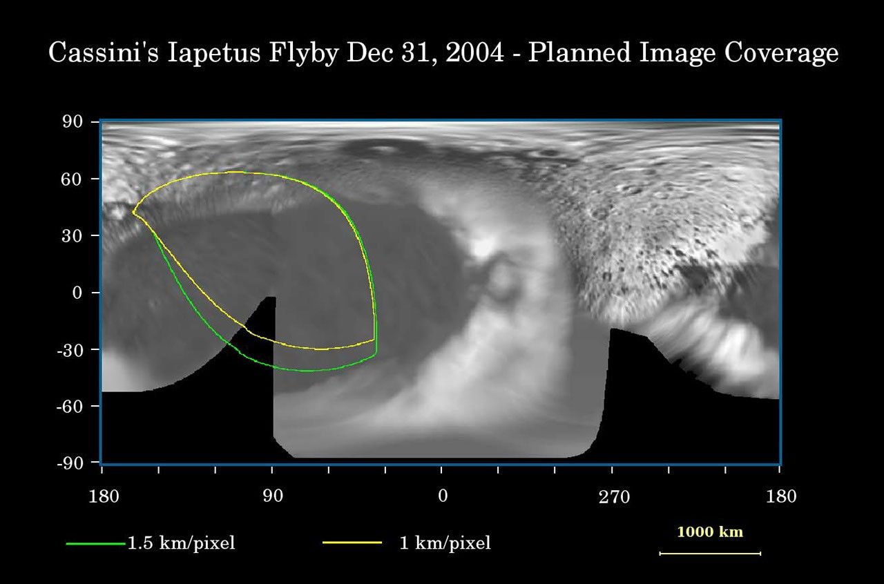This map of the surface of Saturn's moon Iapetus (1,436 kilometers, or 892 miles across), generated from images taken by NASA's Voyager spacecraft, illustrates the imaging coverage planned during Cassini's flyby on Dec. 31, 2004.